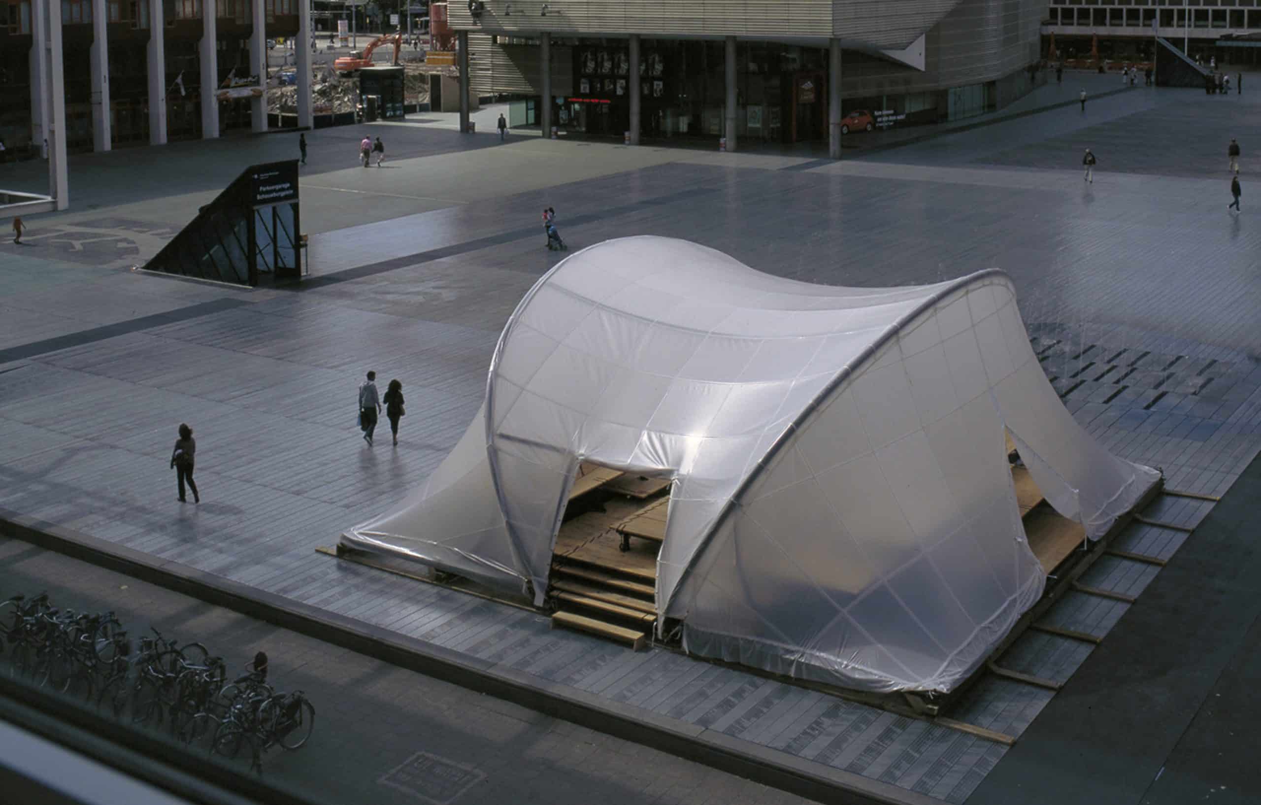 • In het paviljoen komen beeldende kunst, ontwerp, architectuur en voordracht bij elkaar. De voordracht is een onvermijdelijke gebeurtenis. Het publiek zit van alle kanten rondom de muzikant. Je kunt met recht spreken van een dialoog tussen uitvoerend muzikant en toehorend publiek.