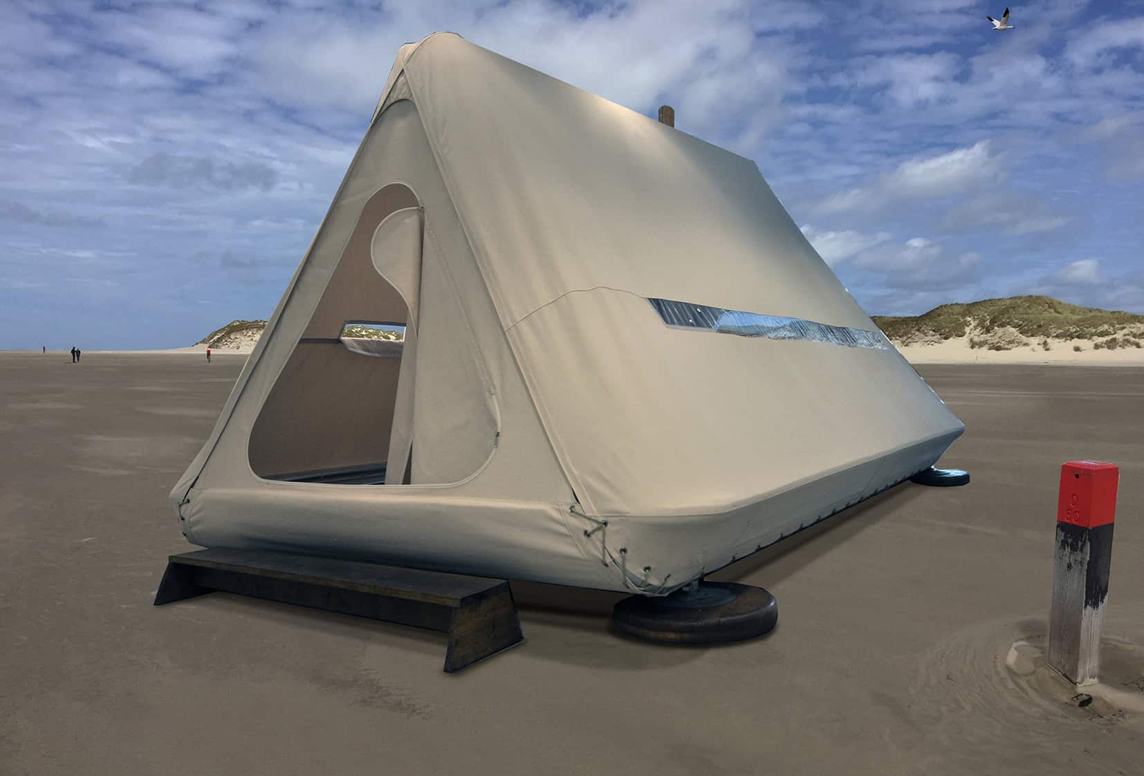 in which Atelier Dré Wapenaar is relating it’s work with design; the cliché idea of a triangular shaped tent transformed into a monumental sculpture.