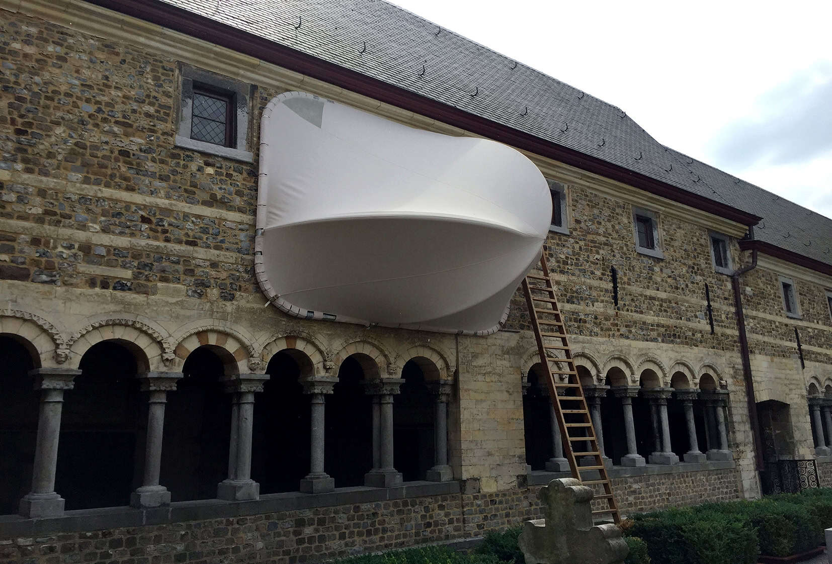 Hanging from a wall the work shapes out to 1.60 meters and fits 2 people to sleep inside.